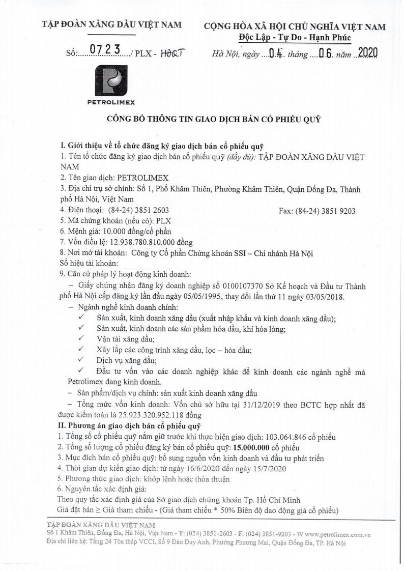 PLX công bố thông tin giao dịch bán cổ phiếu quỹ